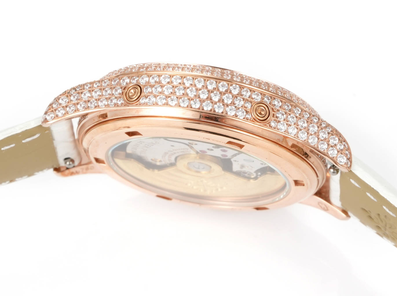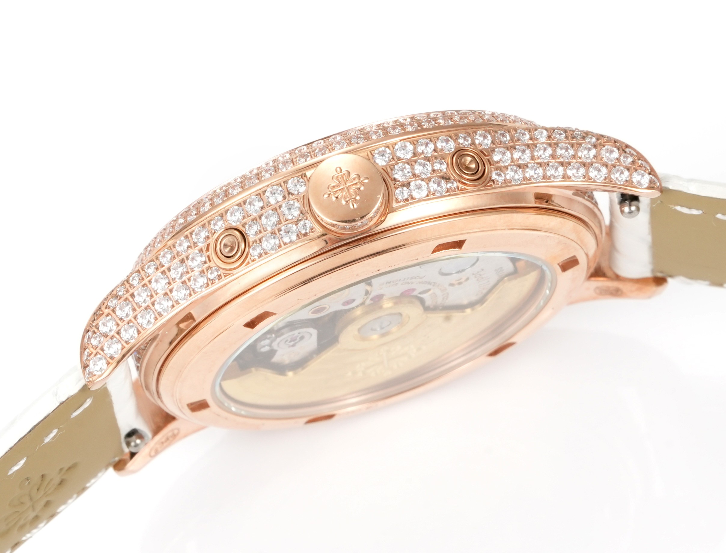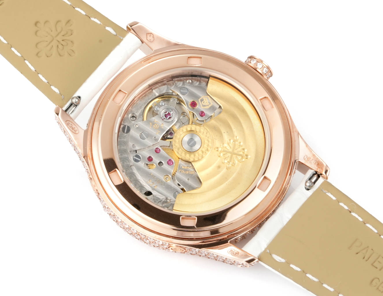 BACK: olygonal polished Swiss 316L steel snap-in rim with Patek Philippe engravings, the transparent sapphire crystal mechanics-revealing center